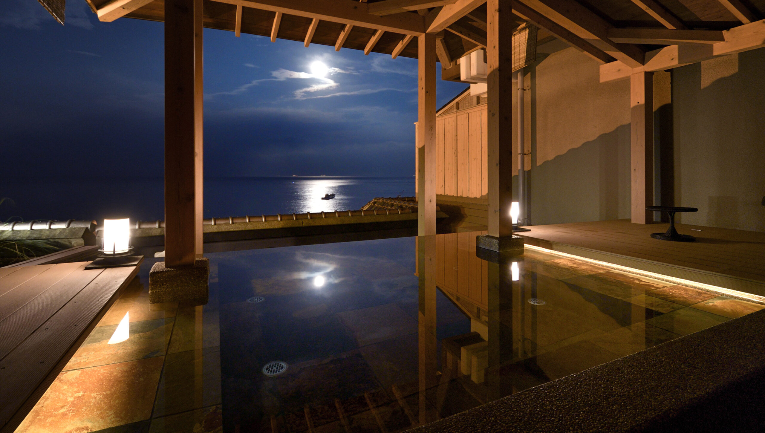 海に輝くムーンロードが望める「伊豆北川温泉 望水」。一面に広がる相模灘と大島を望む絶景が魅力です。