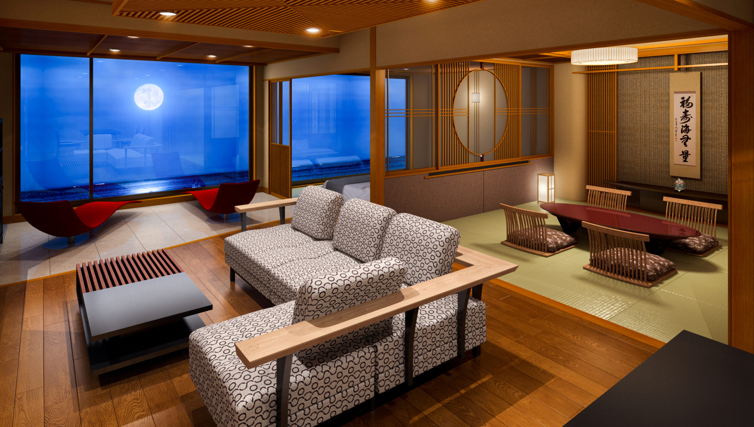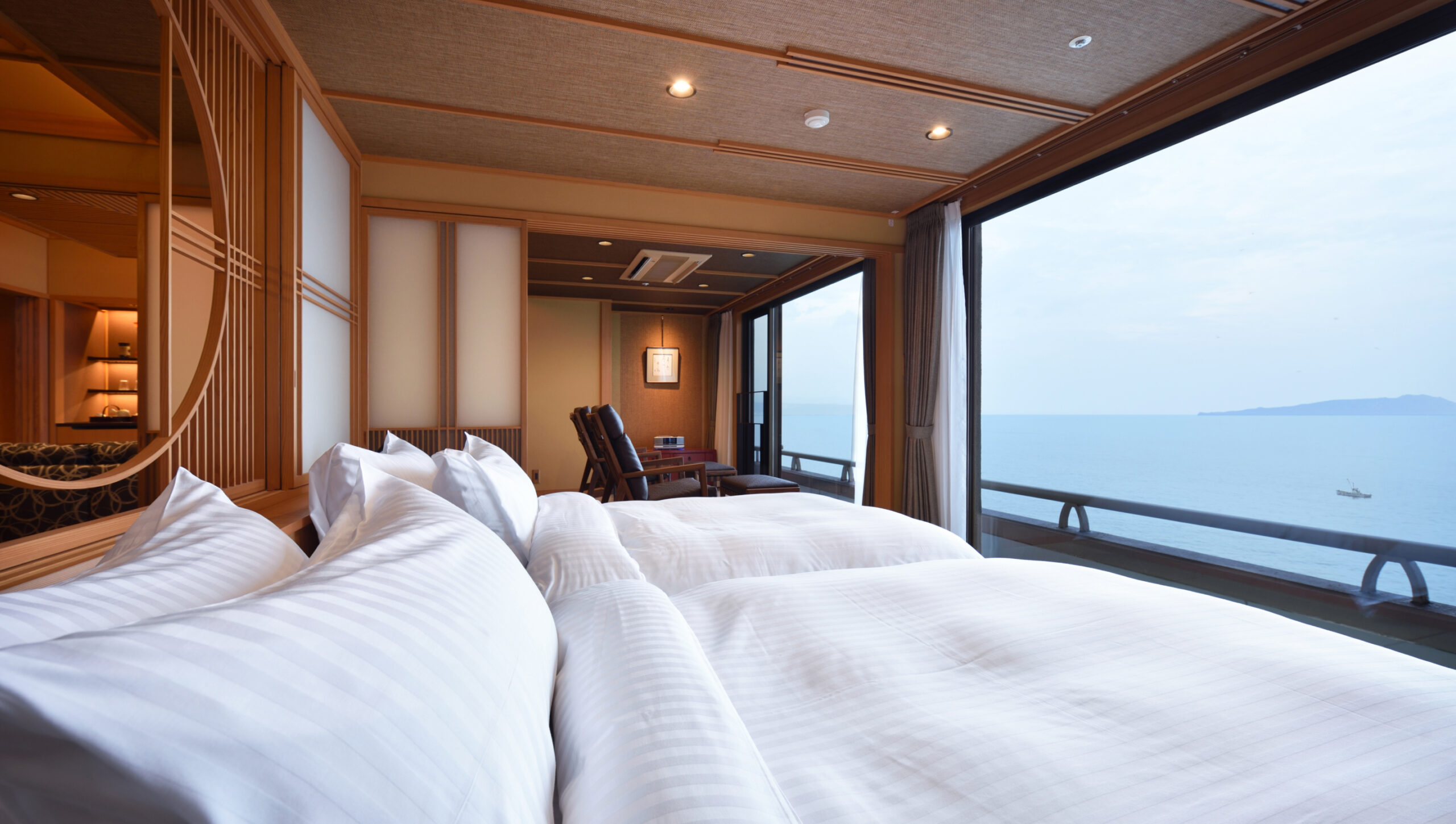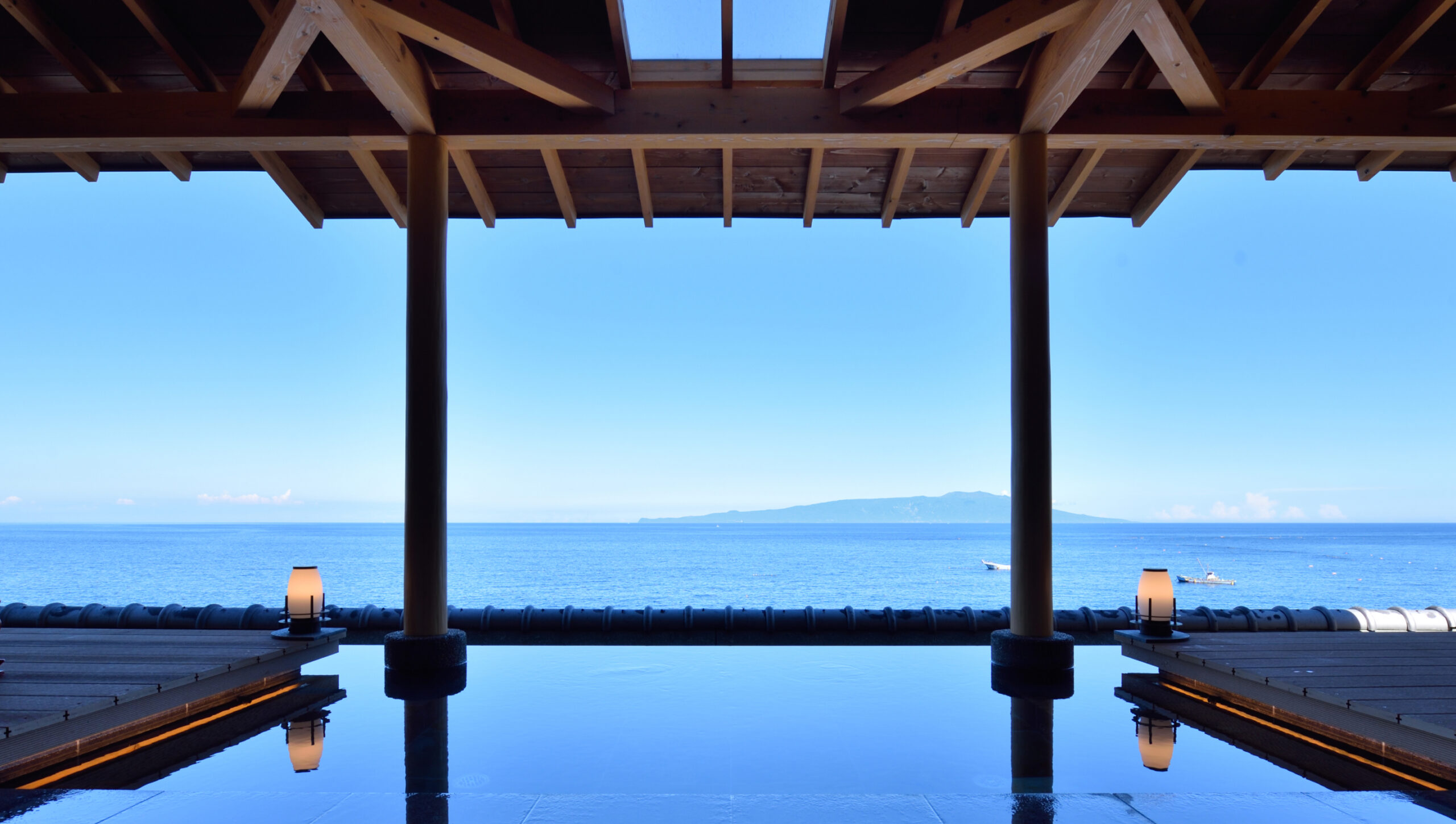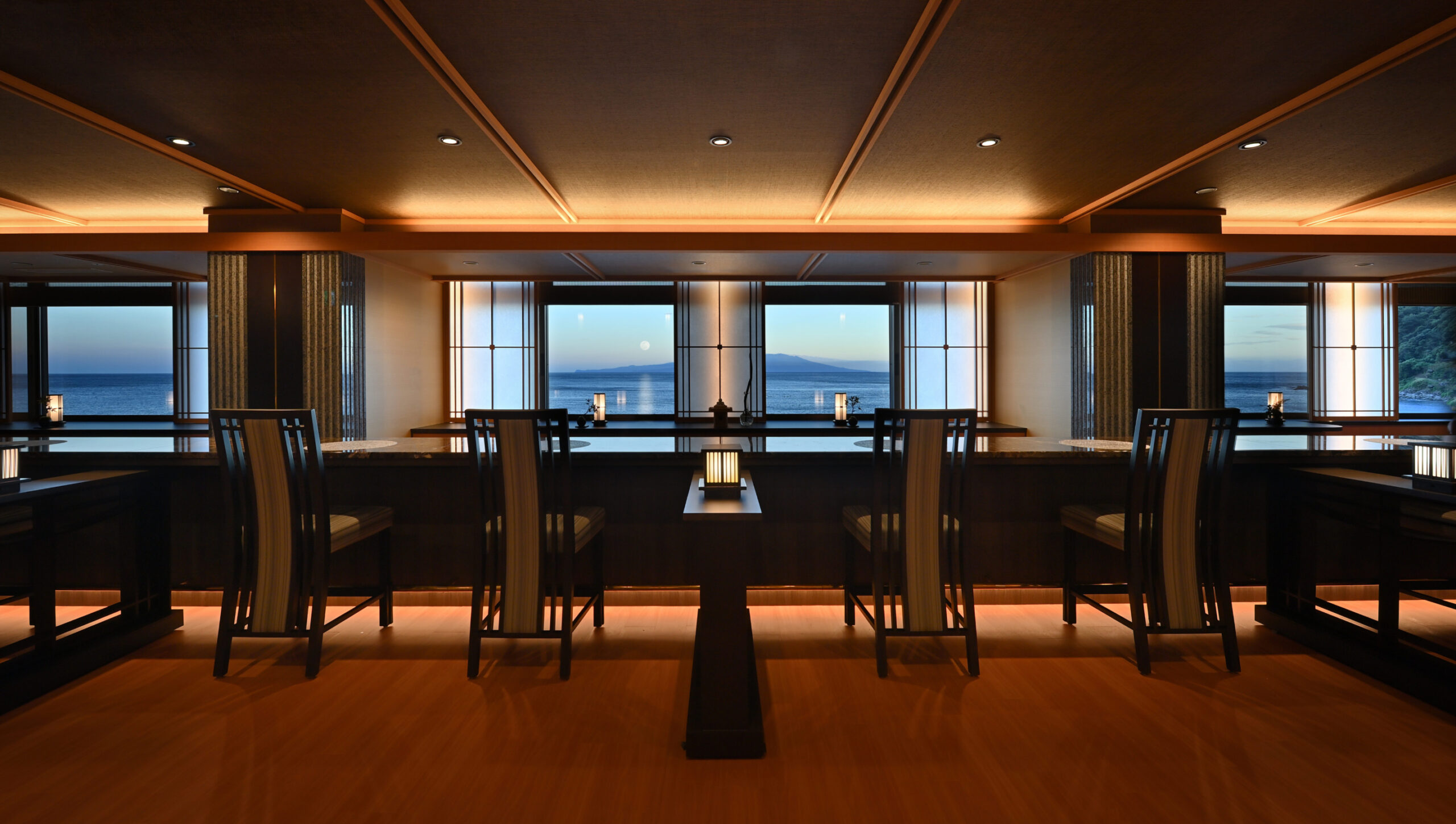 海に輝くムーンロードが望める「伊豆北川温泉 望水」。一面に広がる相模灘と大島を望む絶景が魅力です。